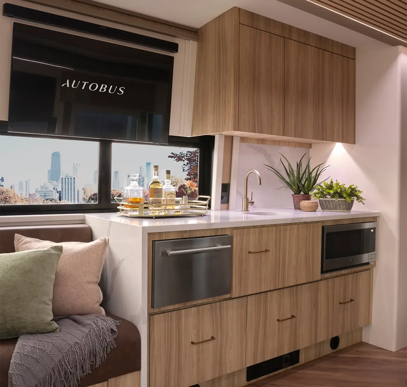 Each interior is meticulously designed to offer a serene and stylish environment, combining elegant finishes with advanced amenities for the ultimate travel experience. Here are just a few features that set our buses apart: